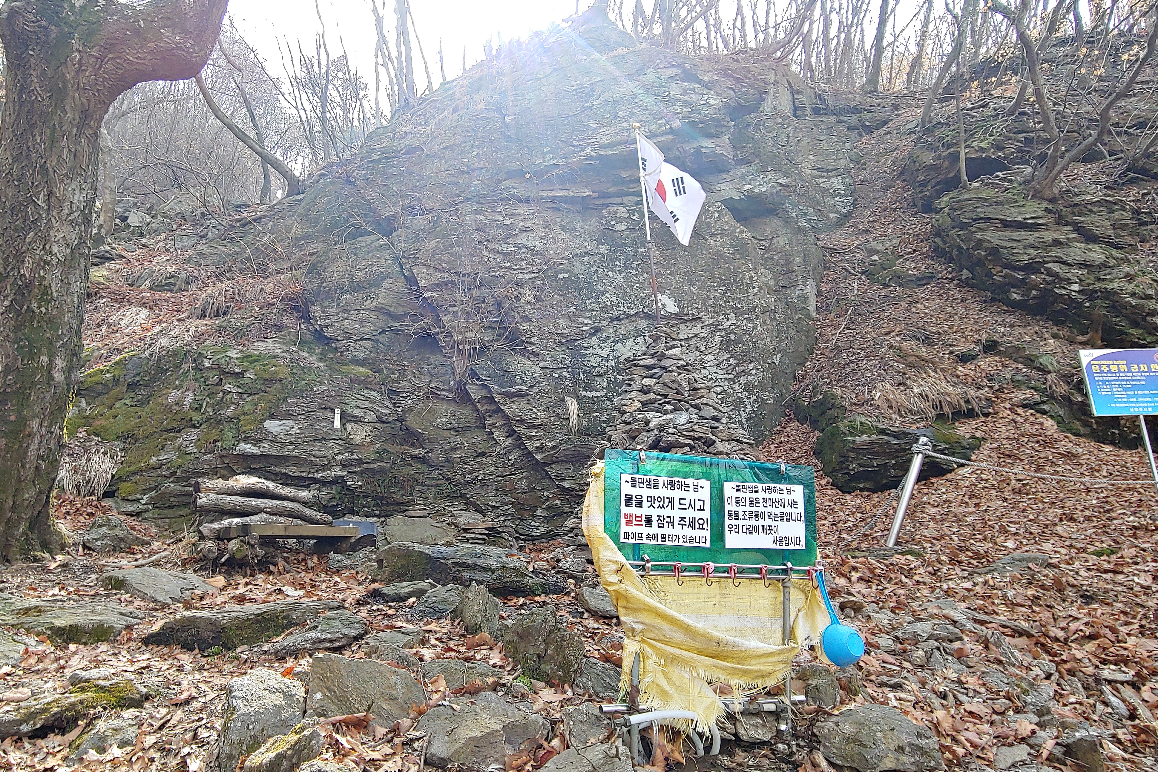 돌핀샘쪽 산행로는 이용객이 많지 않아서 인지, 낙엽이 많이 덮여 있어 자칫 길을 잃을 수도 있겠다 싶었다. 낙엽이 미끄러워 주의하지 않으면 구를 수도 있겠다 싶었다. 2~3군데 갈림길에 이정표가 필요하겠다 싶기도 했다.