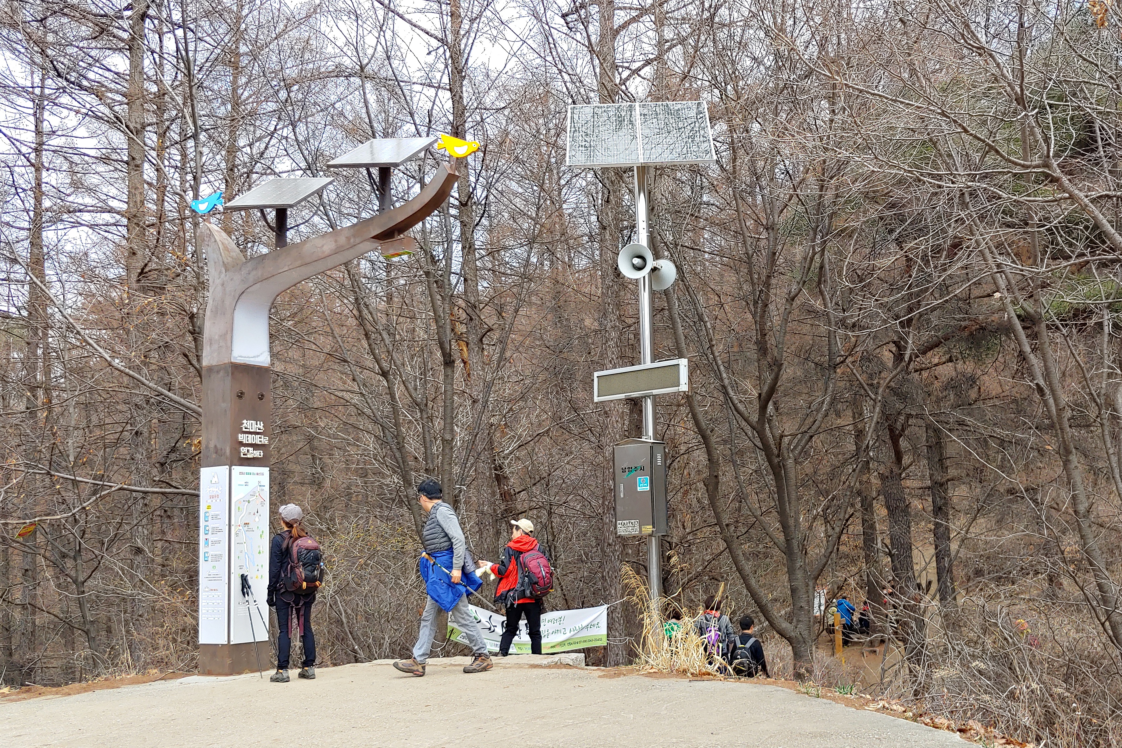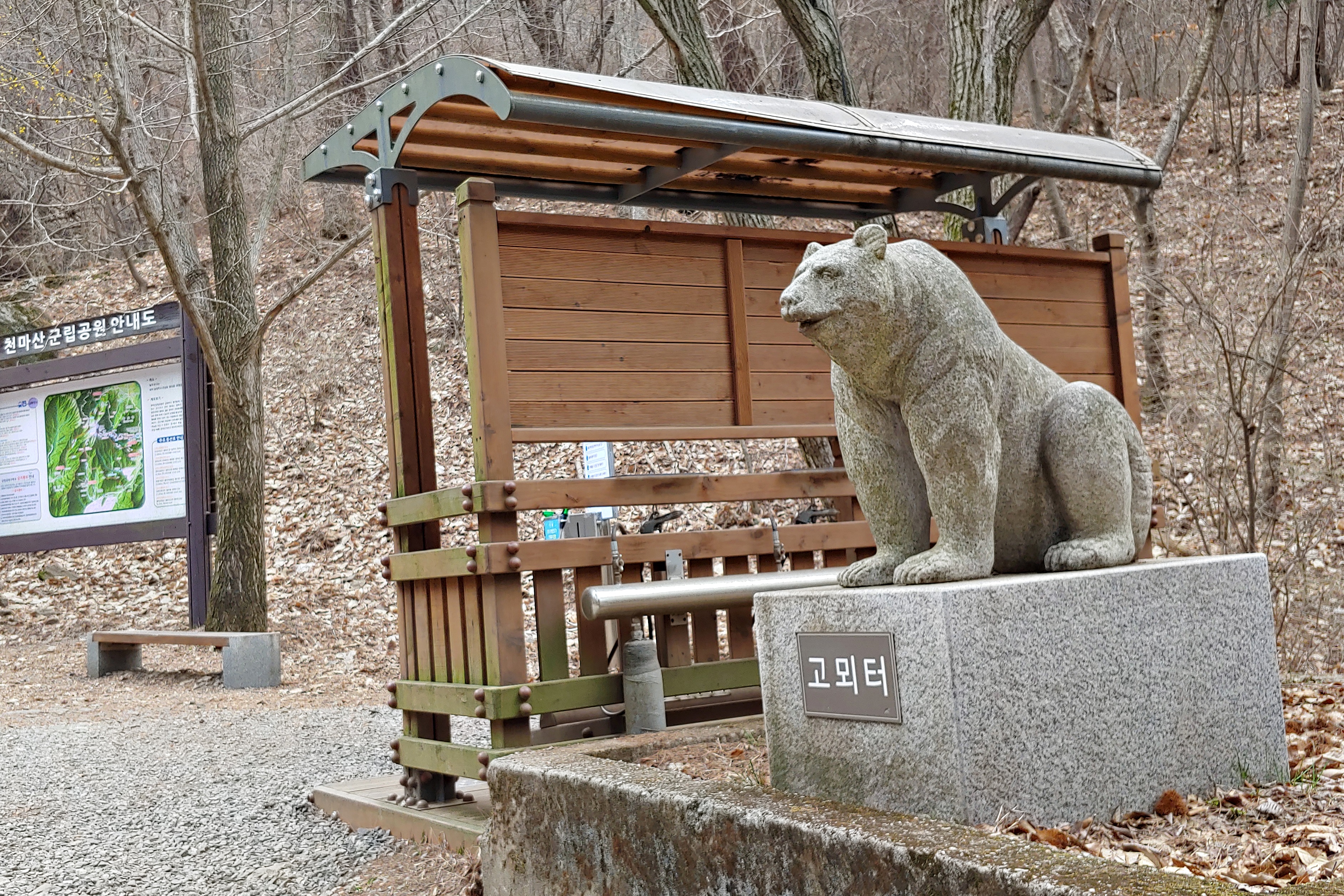 식당들 뒤편의 탐방로로 들어서니 하늘을 곧게 뻗은 나무들로 이뤄진 숲길이 기분이 좋아진다. 고뫼터에 자리잡은 곰을 만나고 조금더 가니 상명대학교 생활관 앞에서 임도와 숲길 갈림길이 나타난다. 천왕봉 전상 화살표는 숲길로 향한다. 어느 길로 가도 상관없다. 얼마 안가서 만난다. 임도는 걷기 편하고 숲길은 거리가 짧은 각자의 장점이 있다. 올라갈 때는 숲길을 내려올 때는 임도를 선택했다.